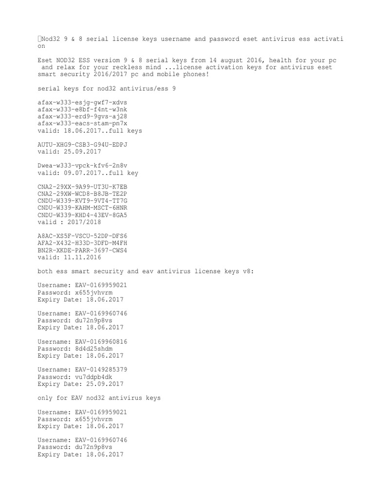 Key nod32 all update. Eset smart security activation license 10 11 premium keys eset smart security activate 9 premium keys 2019 eset nod32 antivirus eset nod32 username and password.