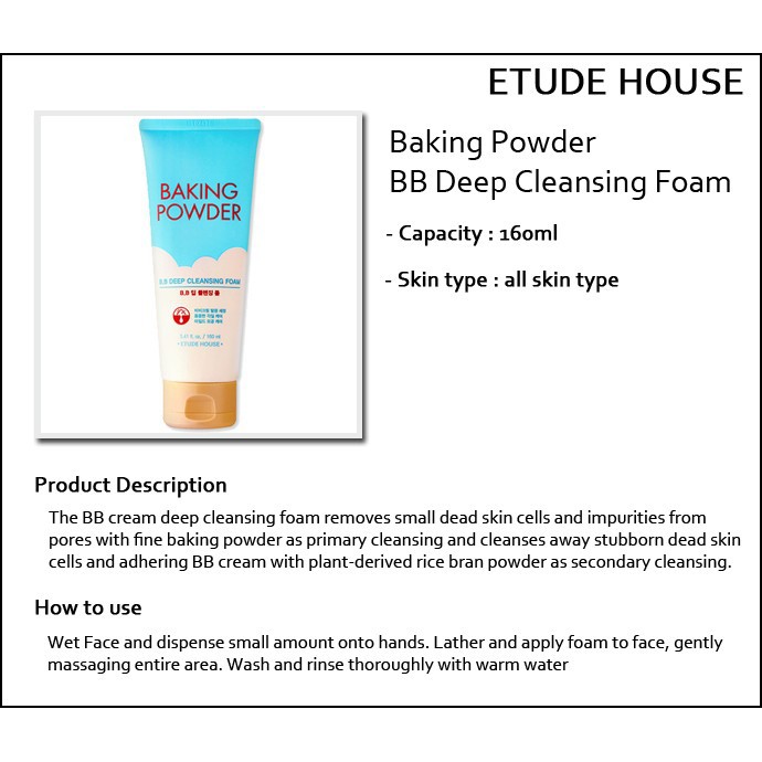 You can also choose between different etude house baking powder bb deep cleansing foam variants with 160ml starting from 265 00. Baking powder b b deep cleansing foam. Official website of etude for global customers. The bb cream deep cleansing foam removes small dead skin cells and impurities from pores with fine baking powder as primary cleansing and cleanses away stubborn dead skin cells and adhering bb cream with plant derived rice bran powder as secondary cleansing.