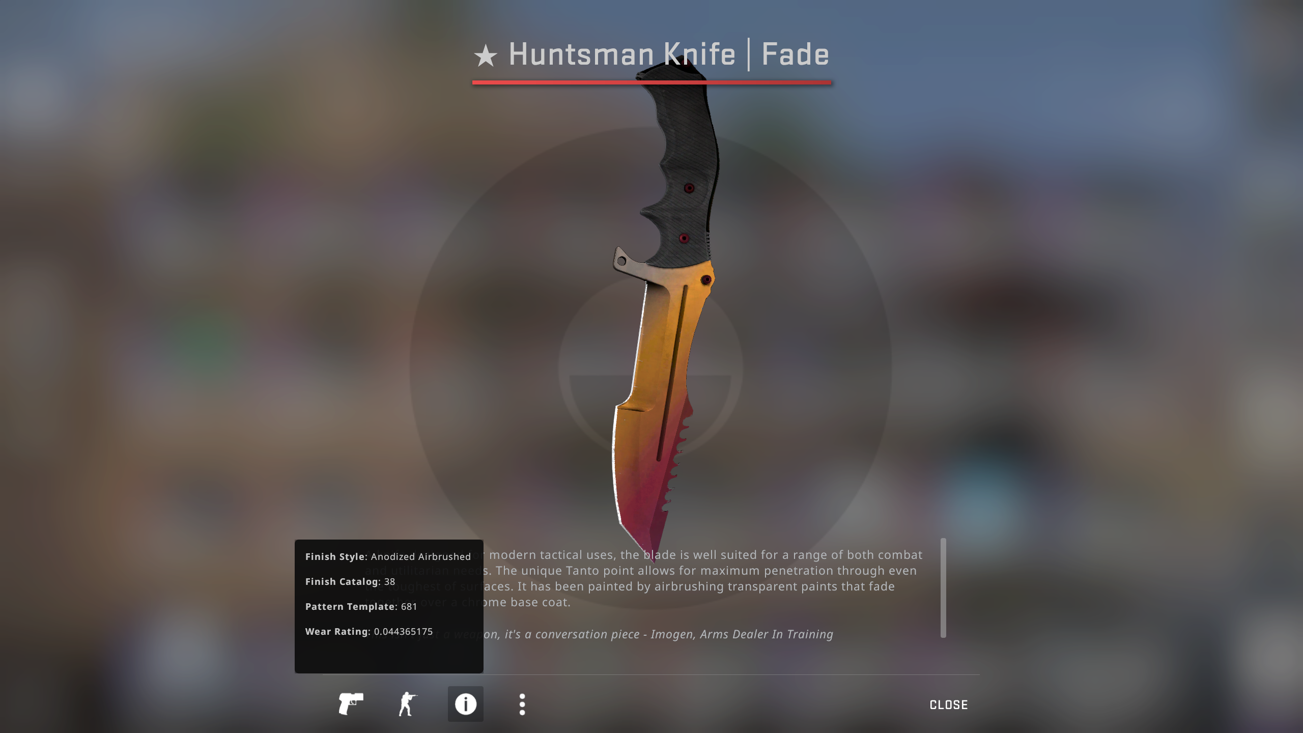 Huntsman knife fade skin prices market stats preview images and videos wear values texture pattern inspect links and stattrak or souvenir drops. The appearance of huntsman knife marble fade highly depends on the pattern index. The pattern index affects the color ratio of the skin. It has been confirmed that fire ice patterns do not occur on the new knife finishes.